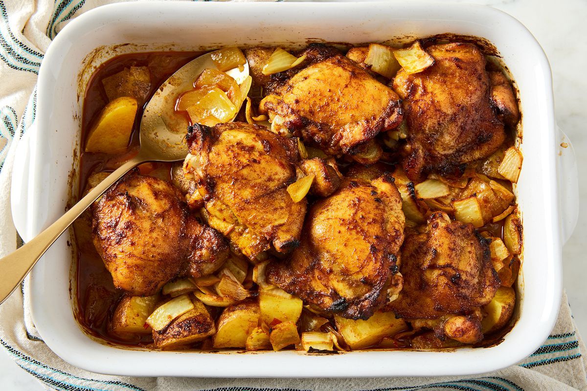 Surové zemiaky nakrájajte na plátky a vložte do vymasteného pekáča. Posypte ich soľou, korením, kminom a grilovacím korením. Pridajte nakrájanú cibuľu a sušené paradajky (ak máte slaninu, pridajte ju tiež). Všetko premiešajte a na túto vrstvu položte mäso opečené v ceste.